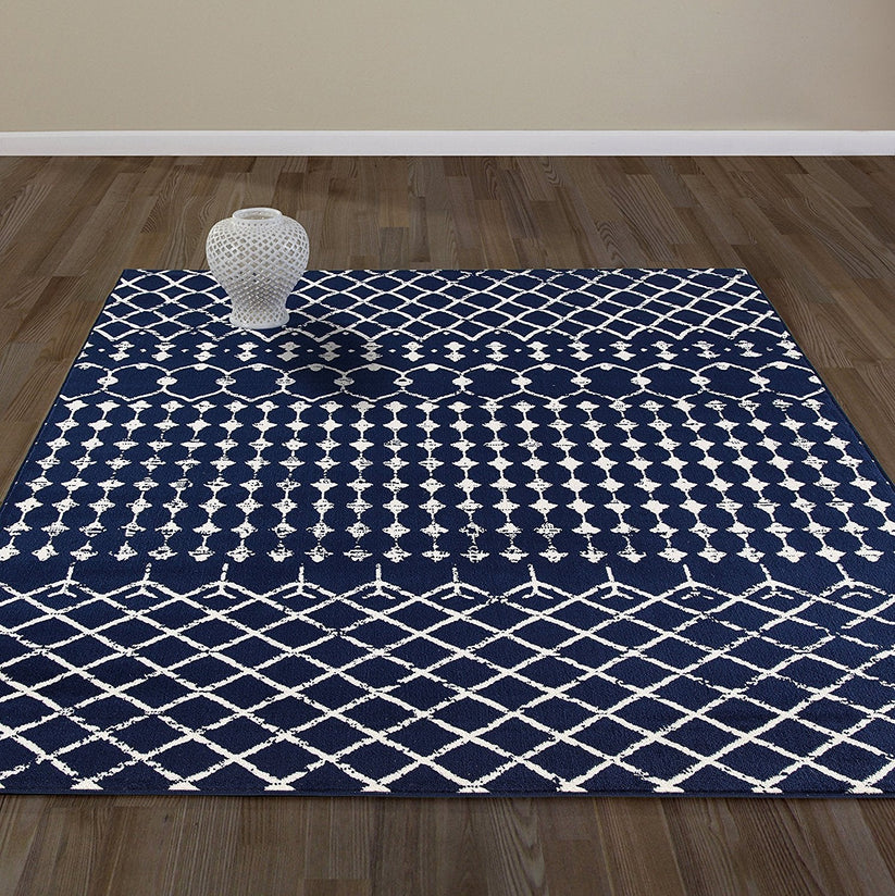 Der TrellisCharm Contemporary Teppich bringt ein modernes Gitterdesign in harmonischen Farbtönen von Navy, Elfenbein und Türkis in Ihre Wohnräume. Dieses elegante Muster sorgt für einen klaren, stilvollen Look und schafft eine einladende Atmosphäre. Die weiche Oberfläche bietet Komfort für Ihren Alltag, während die strapazierfähigen Materialien eine einfache Pflege und dauerhafte Schönheit gewährleisten. Ideal für Wohnzimmer, Schlafzimmer oder Flure, fügt sich dieser Teppich nahtlos in jeden Einrichtungsstil ein und ist der perfekte Begleiter für ein modernes Zuhause.