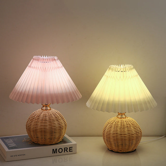 RattaLume Nordic LED Tischlampe | Geflochtenes Rattan & Faltstoffschirm | Stimmungslicht | Deko fürs Schlafzimmer