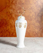 - Elegantes Design: Weißes Glas mit einem kunstvoll gestalteten Baumdeckel.
